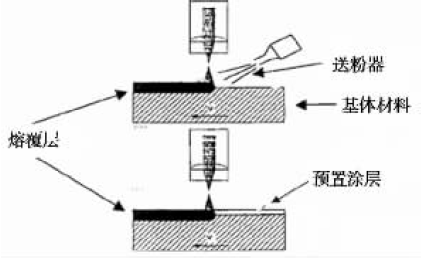 為了防止在高速、高溫、高壓、重載、腐蝕介質(zhì)等環(huán)境下工作的零件不因便面的局部損壞而報(bào)廢,提高零件的可靠性,延長使用壽命,世界各國都在研究和應(yīng)用各種提高零件表面性能的表面工程技術(shù)。傳統(tǒng)的表面改性技術(shù),如各種噴涂層。鍍層等,由于較差的層間結(jié)合力以及受平衡溶解度小,及固態(tài)擴(kuò)散性差的限制,應(yīng)用效果并不理想。大功率激光器和寬帶掃描裝置的出現(xiàn),為材料表面改性提供了一種新的有效手段。在各類激光束處理中,激光熔覆是經(jīng)濟(jì)效益較高的一種新的涂層表面改性技術(shù),它可以在廉價(jià)基材上制備出高性能貴重的熔覆層表面,以降低材料成本,節(jié)約貴重稀有的金屬材料,降低能量消耗,提高金屬零件的使用壽命。激光熔覆裝置如圖所示,其中上圖所示的是同步送粉法,下圖為預(yù)置涂層法。