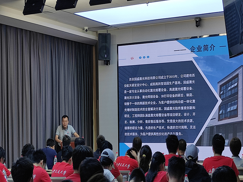 隨后,技術(shù)總監(jiān)呂文輝簡(jiǎn)單介紹了公司的概況:“西安國(guó)盛激光成立于 2015 年,經(jīng)過(guò)多年的發(fā)展,已經(jīng)成為一家專(zhuān)業(yè)從事自動(dòng)化激光熔覆設(shè)備、高速激光熔覆設(shè)備、激光淬火設(shè)備、激光焊接設(shè)備、3D 打印設(shè)備研發(fā)、制造、銷(xiāo)售于一體的高科技企業(yè)。我們始終秉持著創(chuàng)新驅(qū)動(dòng)、質(zhì)量為本的理念,致力于為客戶(hù)提供結(jié)構(gòu)功能一體化激光增材制造技術(shù)的全套解決方案。他還著重介紹了西安國(guó)盛激光在激光行業(yè)所取得的豐碩發(fā)展成果,如在激光熔覆、激光淬火、激光清洗及 3D 打印等核心技術(shù)上的創(chuàng)新突破,以及這些技術(shù)在石油、化工、鋼廠、航天等多個(gè)重要領(lǐng)域的成功應(yīng)用案例。最后,呂文輝總監(jiān)語(yǔ)重心長(zhǎng)地勉勵(lì)在場(chǎng)的大學(xué)生們,要珍惜在校時(shí)光,努力豐富知識(shí)儲(chǔ)備,提升自身綜合素質(zhì),為未來(lái)更好地融入社會(huì)發(fā)展做好充分準(zhǔn)備。”