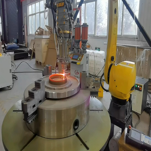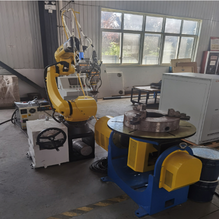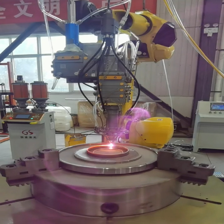 八軸聯(lián)動激光熔覆設(shè)備,是國盛激光自主研發(fā)的以機(jī)器人為運(yùn)動核心,可適應(yīng)各種復(fù)雜結(jié)構(gòu),和非標(biāo)準(zhǔn)零件的激光熔覆加工系統(tǒng)。該系統(tǒng)配置靈活多樣,根據(jù)客戶應(yīng)用場景可配置不同規(guī)格的機(jī)器人,同時選配變位機(jī)、轉(zhuǎn)臺、滑臺以適應(yīng)不同加工類型工件的激光熔覆加工及表面處理。設(shè)備主要由前端執(zhí)行機(jī)構(gòu)和后端設(shè)備組成,前端執(zhí)行機(jī)構(gòu)包括機(jī)械臂、變位機(jī)、電氣控制系統(tǒng)、激光熔覆頭、熔覆噴嘴組成;后端設(shè)備包括熔覆專用激光器、熔覆專用水冷機(jī)、穩(wěn)壓電源、送粉器等。
